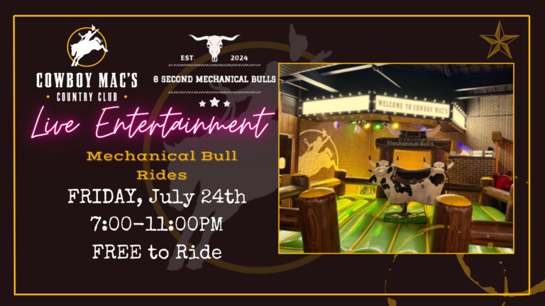 Hold on tight, it’s Mechanical Bull Night at Cowboy Mac’s! We’re bringing the arena back for another round of high‑energy rides and unforgettable fun. Test your balance, challenge your friends, or kick back with a drink and enjoy the show. Whether you’re brave enough to climb on or just here for the laughs, it’s a…