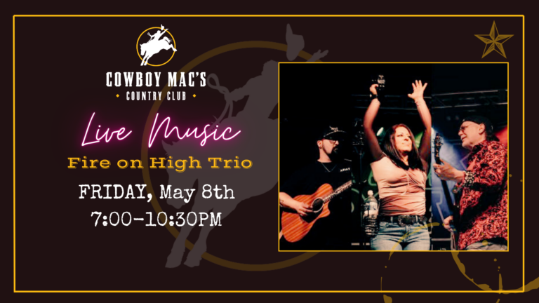 Check out Fire on High, featuring Keith, Jo, and Jesse, bringing great vocals and a close‑up, high‑energy performance. With a mix of country favorites and classic rock, they deliver a variety of music that keeps the crowd entertained. Grab a drink, bring your friends, and enjoy a fun night of live music at Cowboy Mac’s!